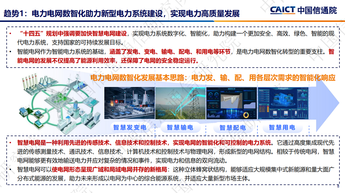 會上,中國信通院云大所政企數字化轉型部副主任董恩然指出,能源行業數智化轉型的趨勢之一是以電力電網數智化助力新型電力系統建設,實現電力高質量發展。而電力電網數智化發展基本思路則是電力發、輸、配、用各層次需求的智能化響應。