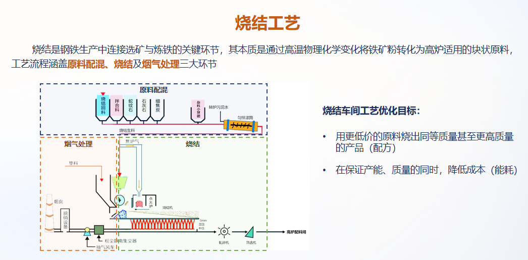 第二個落地場景是鋼鐵廠燒結(jié)工藝優(yōu)化。礦石磨粉后不能直接送到高爐冶煉,需要與石灰粉、粘合劑、水等混合成糊狀(含水量約7.8%),燒結(jié)成塊狀物后才能用于煉鐵。整個燒結(jié)工藝包含原料配混、燒結(jié)、煙氣處理三大核心環(huán)節(jié)。