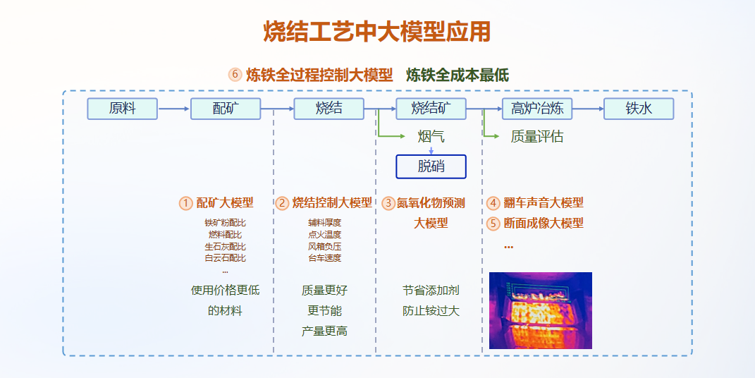 ⑤斷面成像大模型:斷面成像現(xiàn)在用紅外技術(shù),圖像已經(jīng)取過來了,但一直是靠燒結(jié)工肉眼觀察。我們可以通過預(yù)訓(xùn)練處理,訓(xùn)練出質(zhì)量判斷模型,讓大模型自己判斷燒結(jié)分布均勻還是不均勻。