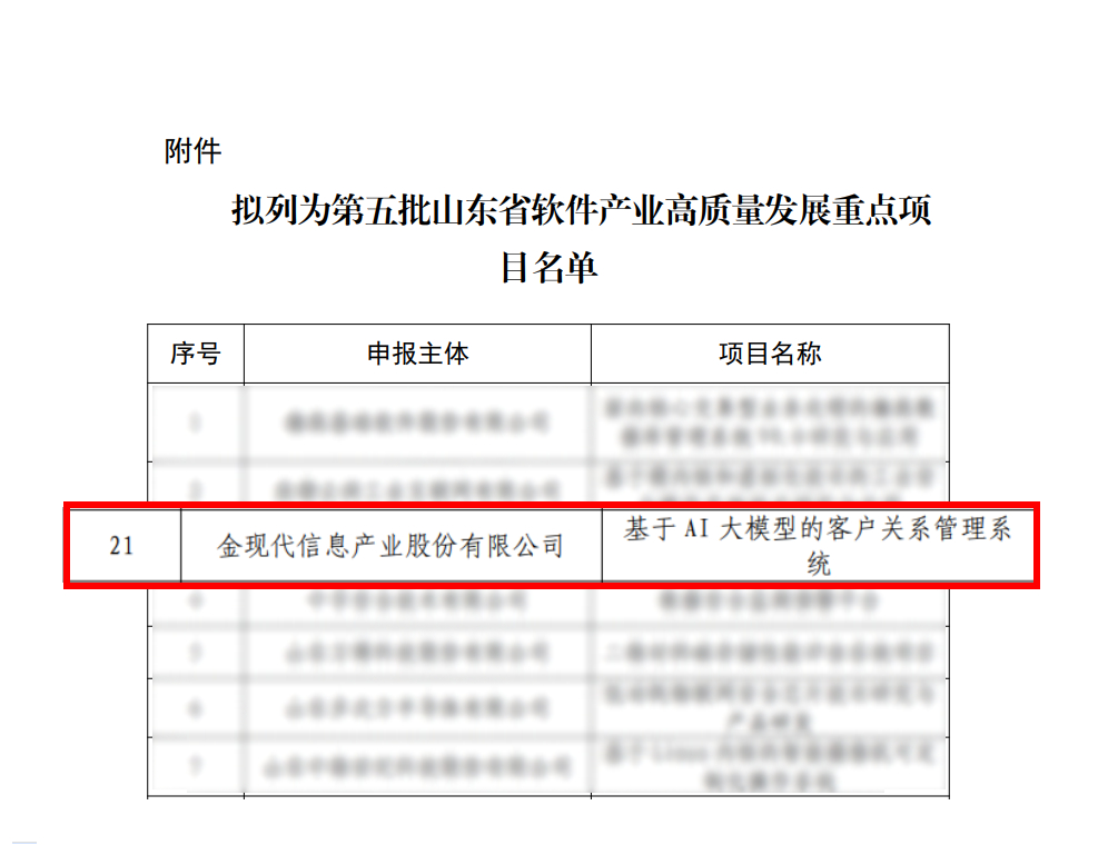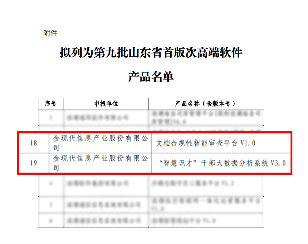 近期,山東省工信廳接連公示第九批“山東省首版次高端軟件產品”、第五批“山東省軟件產業高質量發展重點項目”名單,金現代文檔合規性智能審查平臺、智慧識才干部大數據分析系統、基于AI大模型的客戶關系管理系統入選,產品技術先進性和市場競爭力備受認可。