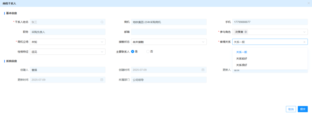 首先要擴展聯(lián)系人屬性字段,新增 “角色類型”(決策者 / 影響者 / 使用者)、“個人偏好”(溝通方式、關注議題)、“態(tài)度傾向”(支持 / 中立 / 反對)等維度。