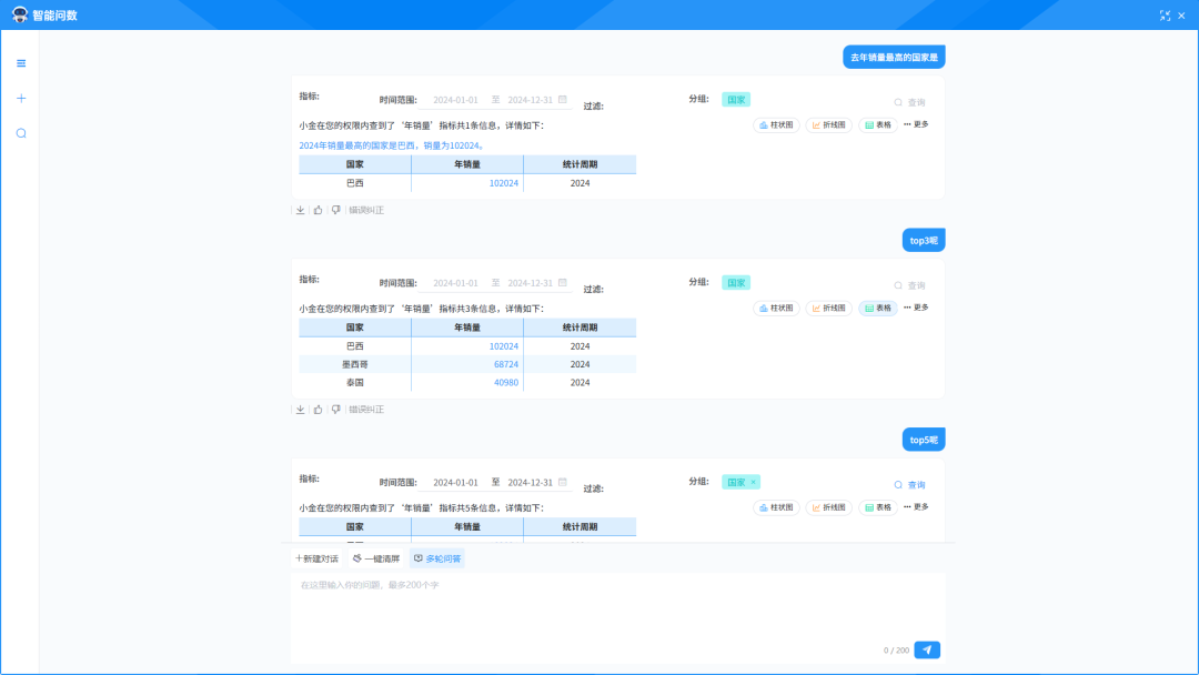 知道了“去年銷量最高的國家是巴西”,想接著問“前三名有哪些”,還得重新操作一遍。