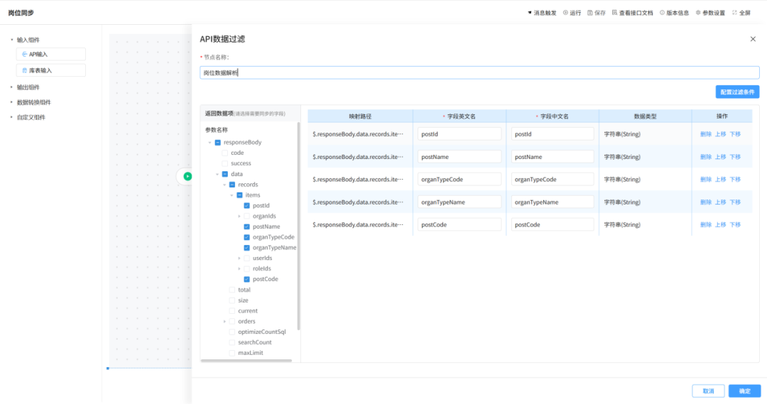 平臺在接口開發階段,首創設計態可視化的數據結構展示功能:通過圖形化界面直觀呈現接口的參數格式、數據類型、邏輯關系等核心信息,研發人員可根據需求直接修改字段等內容。