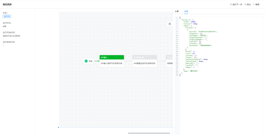 上線調試階段,平臺有單步調試功能,每一步的輸入輸出都清清楚楚。還能自動存歷史報文,出了問題調出來回放一下,很快就能定位原因,有效縮短調試時間,降低上線風險。